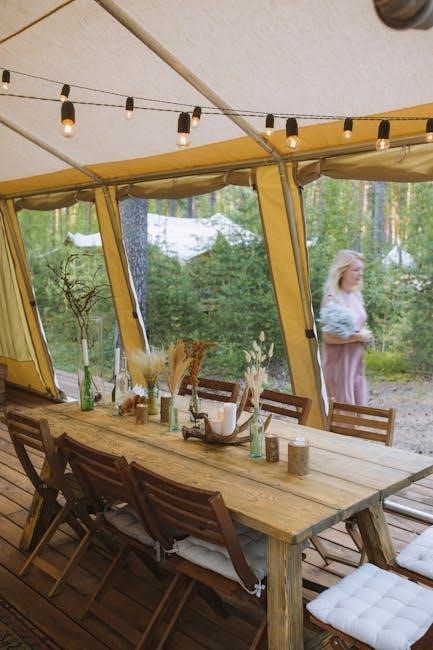 Enhance the ambiance of your 10×30 canopy tent with optional lighting and decoration ideas; String lights‚ fairy lights‚ or LED lights can create a warm and inviting atmosphere‚ perfect for evening events. Hanging lanterns in various colors or patterns add a festive touch. For a more elegant look‚ consider draping fabric or ribbons across the tent’s frame. Themed decorations‚ such as floral arrangements or seasonal motifs‚ can tailor the space to your event’s style. Table centerpieces‚ banners‚ and decorative signs also personalize the setting. Ensure all lighting is waterproof and securely fastened to avoid damage or safety hazards. These accessories transform the tent into a visually stunning space‚ making it ideal for weddings‚ parties‚ or corporate gatherings.
